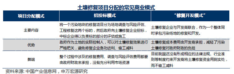 “先修復,再出讓”資金依賴政府,不可持續(xù)。從企業(yè)獲得土壤修復項目角度看,目前應用最廣泛的商業(yè)模式主要有BOT和EPC兩種模式。