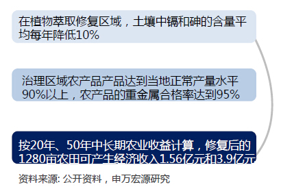 按20年、50年中長期農(nóng)業(yè)收益計算,修復后的1280畝農(nóng)田可產(chǎn)生經(jīng)濟收入1.56億元和3.9億元在植物萃取修復區(qū)域,土壤中鎘和砷的含量平均每年降低10%治理區(qū)域農(nóng)產(chǎn)品產(chǎn)品達到當?shù)卣.a(chǎn)量水平90%以上,農(nóng)產(chǎn)品的重金屬合格率達到95%