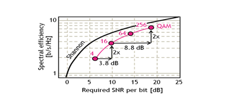 傳輸?shù)谋举|(zhì)就是以更高的頻譜效率和更低成本進(jìn)行長距離的信息傳送。在超100G時(shí)代,進(jìn)一步提升系統(tǒng)容量和性能將面臨巨大的挑戰(zhàn)。因此如何在效率和成本之間找到一個(gè)平衡點(diǎn),將影響著400G標(biāo)準(zhǔn)的發(fā)展。從香農(nóng)曲線與調(diào)制方式的關(guān)系圖中可以看出,進(jìn)一步增加頻譜效率意味著更高的信噪比要求,這也將直接導(dǎo)致400G系統(tǒng)的技術(shù)實(shí)現(xiàn)難度大大增加和成本快速上升。