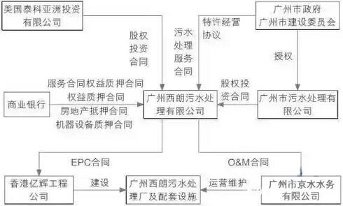 項目主要包括以下幾種合同:a.廣州市建委代表政府與項目公司簽訂具有特許經(jīng)營性質(zhì)的污水處理服務(wù)合同;b.項目公司與投資者簽訂的股權(quán)投資合同;c.項目公司與銀行簽訂的項目抵押貸款合同;d.項目公司與EPC總承包商簽訂的總承包商合同(EPC合同);e.項目公司與運營商簽訂的營運和維護合同(O&M合同)。