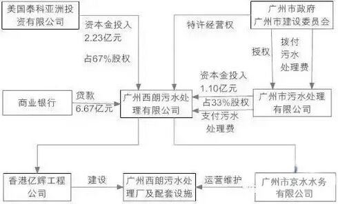 最終形成的投融資結(jié)構(gòu)中,初始資金由權(quán)益資金和債務(wù)資金構(gòu)成,中方廣州市污水處理有限公司和外商投資方美國泰科亞洲投資有限公司分別出資1.10億和2.23億,各持有33%和67%的股權(quán);另外美國泰科亞洲投資有限公司通過美國地球工程公司從中國工商銀行廣東省分行獲得了約66700萬元人民幣的項目抵押貸款,總投資額達9.85億元人民幣。