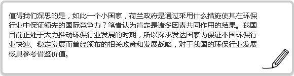 荷蘭在環(huán)境保護政策和法規(guī)方面一直走在時代的前沿,這使得業(yè)界加大了環(huán)保設(shè)備方面的投資力度,同時工業(yè)產(chǎn)值的下降而使政府開始利用市場機制取代法律來提倡環(huán)保。