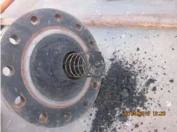 2012年7月對其拆開檢查發(fā)現(xiàn)蒸發(fā)槽內(nèi)底部有黑色、黏稠狀、密度較輕的含油物質(zhì),上部氣氨出口管道及壓力測點上有一層黑色物質(zhì)(見圖三),遂對其進(jìn)行了清理,清理后投運設(shè)備恢復(fù)正常。出現(xiàn)此次異常后,我們對原因進(jìn)行了分析,我廠氨氣制備系統(tǒng)為并聯(lián)制,即兩個蒸發(fā)槽共用一個緩沖罐,一個緩沖罐供給兩個機(jī)組使用,比正常的單元制(一對一)少一個緩沖罐。