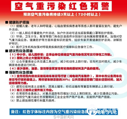 北京市空氣重污染應(yīng)急指揮部于12月7日18時(shí)發(fā)布空氣重污染預(yù)警等級(jí)由橙色提升為紅色預(yù)警,即全市于12月8日7時(shí)至12月10日12時(shí)將啟動(dòng)空氣重污染紅色預(yù)警措施。