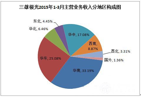 從三雄極光的2015年主營業(yè)務(wù)分地區(qū)構(gòu)成圖來看,三雄極光主要是以內(nèi)銷為主,占住98.64%。而國外僅占1.36%。其中就國內(nèi)部分,主要分為華中、華南、華東、西南、西北、華北和東北7大區(qū)域。其中華東、華南和華東三大區(qū)域超過60%。