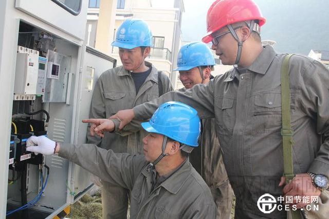 鄞州供電公司員工正在為李岙村光伏電站合閘并網(wǎng)