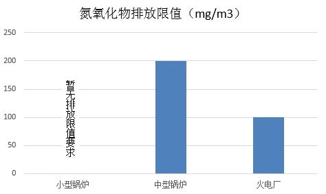 (備注:圖表中的小型鍋爐是指2001年1月1日起建成使用的10t/h以下鍋爐在一類區(qū)的污染區(qū)排放限值;圖表中的中型鍋爐是指10t/h以上鍋爐在重點(diǎn)地區(qū)的大氣污染物特別排放限值;圖表中的火電是指目前重點(diǎn)地區(qū)的火力發(fā)電廠鍋爐的大氣污染特別排放限值。此前的標(biāo)準(zhǔn)中,對于10t/h以下的鍋爐在一類區(qū)的氮氧化物的排放限值沒有限制。)