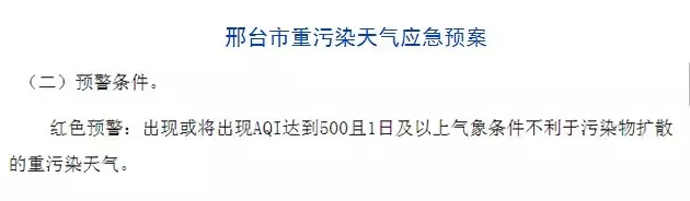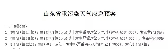 與此相對應(yīng)的,是各省份2013年至2014年發(fā)布的重污染天氣應(yīng)急預(yù)案。河南省、山東省、河北省的預(yù)案分級略有不同。如山東預(yù)警分為“黃、橙、紅”三級,河南、河北則有四級預(yù)警。但對“紅色預(yù)警”的規(guī)定相同,均是“當(dāng)預(yù)測1天及以上發(fā)生極嚴重污染天氣時(AQI≥500),發(fā)布紅色預(yù)警。”