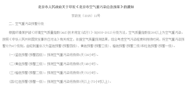 北京市于今年3月發(fā)布了新修訂的《北京市空氣重污染應(yīng)急預(yù)案》。其中,紅色預(yù)警啟動條件為“預(yù)測空氣重污染將持續(xù)3天以上(72小時以上)”,“空氣重污染”指AQI指數(shù)在200以上。