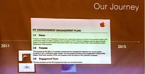 2011年,在IPE發(fā)布了《蘋(píng)果的另一面》的兩期研究報(bào)告之后,蘋(píng)果最終同意公開(kāi)在華的供應(yīng)商名單。而2012年便立即開(kāi)始展開(kāi)綠色選擇聯(lián)盟的第三方審核,讓環(huán)保組織走入工廠(chǎng)!
