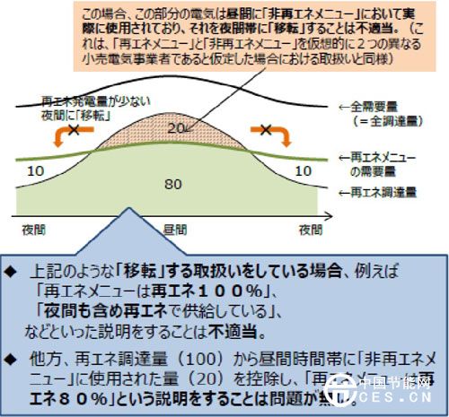 另外,未利用FIT制度的可再生能源發(fā)電站所發(fā)的電力雖可以表述為“可再生能源”,但有些情況不可,如“把白天發(fā)電或采購(gòu)的可再生能源電力視為夜間供給的電力等,將不同時(shí)間段發(fā)電或采購(gòu)的電力量轉(zhuǎn)移計(jì)算的電源構(gòu)成”(圖2)有問(wèn)題的示例。就是說(shuō),要在電源構(gòu)成的介紹上表述為“100%可再生能源”,就不能有可再生能源的時(shí)間性“轉(zhuǎn)移”。