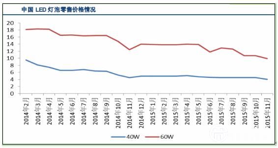 2015年11月全球取代40W的LED燈泡零售價格下降3%,至10.8美元;取代60W的LED燈泡價格下降3%,至14.6美元。其中,英國、德國地區(qū)繼10月份價格有所回調(diào)后,11月份價格均出現(xiàn)下降。