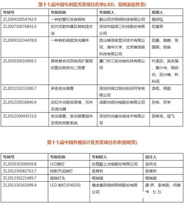 12月2日,國家知識產(chǎn)權(quán)局公布了第十七屆中國專利獎(jiǎng)授獎(jiǎng)的決定,三安光電、超頻三、同方照明等約7家LED及照明公司獲得了第十七屆中國專利優(yōu)秀獎(jiǎng)。此外,勤上光電、得邦照明、吳育林、程瑞琪共2家照明企業(yè)及2位設(shè)計(jì)者獲得了第十七屆中國外觀設(shè)計(jì)優(yōu)秀獎(jiǎng)。具體名單查看下表: