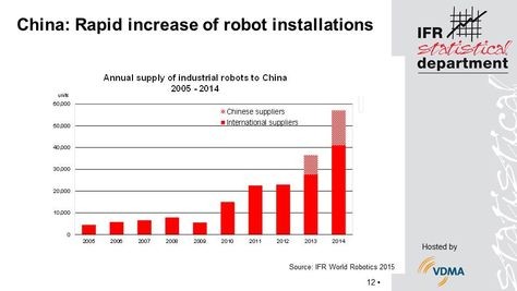 2018年,中國(guó)工業(yè)機(jī)器人安裝量將占全球三分之一以上。此時(shí)此刻,中國(guó)正付出前所未有的努力在自動(dòng)化的比賽中迎頭追趕。最新數(shù)據(jù)顯示,2014年中國(guó)的工業(yè)機(jī)器人銷量飆升至57000臺(tái),增長(zhǎng)了56%。這一數(shù)據(jù)來(lái)自于由國(guó)際機(jī)器人聯(lián)合會(huì)在2015年全球機(jī)器人統(tǒng)計(jì)上發(fā)布的。中國(guó)政府的競(jìng)爭(zhēng)性計(jì)劃“中國(guó)制造2025”使其機(jī)器人行業(yè)迎來(lái)大爆發(fā)。