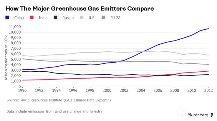 下圖可見(jiàn)全球主要碳排放國(guó)家地區(qū)各自排放量變化。