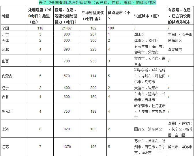 根據(jù)對全國已建、在建、籌建(已立項)餐廚垃圾處理設(shè)施的不完全統(tǒng)計(見表7-2),目前餐廚垃圾總處理能力較高的省、直轄市有:山東(1600噸/日)、江蘇(1370噸/日)、廣東(1300噸/日)、湖南(1265噸/日)、浙江(1110噸/日)、湖北(1070噸/日)、安徽(1000噸/日),海南(100噸/日)、西藏較低。