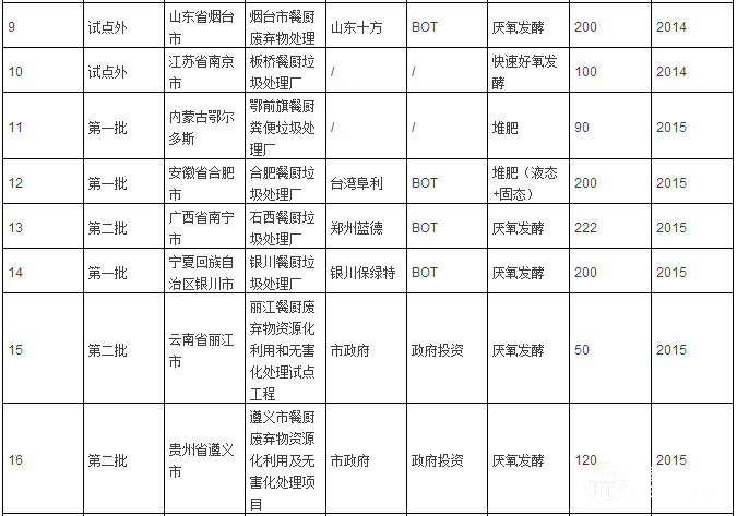 2014年7月,國家發(fā)改委公示了第四批餐廚廢棄物資源化利用和無害化處理試點(diǎn)城市,陜西省西安市、浙江省衢州市等17個城市入圍。2015年5月,發(fā)改委又公示了第五批餐廚廢棄物資源化利用和無害化處理試點(diǎn)備選城市,湖北省十堰市、山東省臨沂市等17個城市入圍名單。加上2011年、2012年和2013年公布的三批試點(diǎn)城市,目前餐廚垃圾處理試點(diǎn)城市(區(qū))已達(dá)100個,覆蓋了32個省級行政區(qū)。