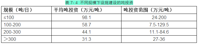 (2)按設(shè)施規(guī)模計算噸投資(如表7-4所示),發(fā)現(xiàn)100噸/日以下規(guī)模的餐廚垃圾處理設(shè)施噸投資普遍偏高,有條件的地區(qū)宜考慮建設(shè)規(guī)模在200噸/日左右的餐廚垃圾處理設(shè)施,必要時可考慮跨區(qū)域處理。