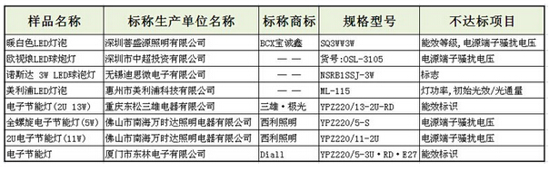 今年6-10月,廣州市消委會工作人員會同檢測站工作人員以普通消費者的身份,在廣州市燈具市場、超市及五金店隨機購買,共購買樣品20批次,其中節(jié)能燈10批次,LED燈10批次,并委托廣州質(zhì)量監(jiān)督檢測研究院對樣品進行測試。結(jié)果顯示,節(jié)能燈、LED燈各有4個樣品被檢出不達標(biāo)項目(見下表)。