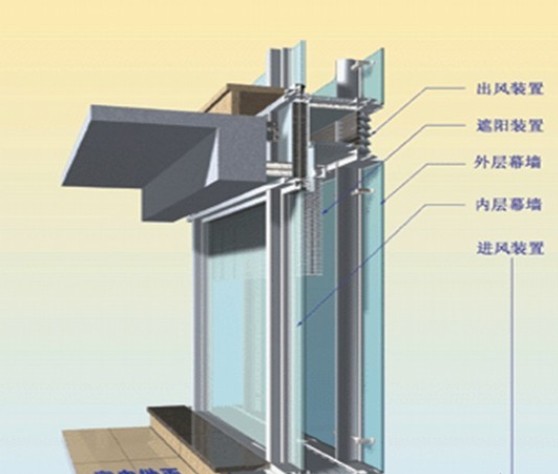 雙層動態(tài)節(jié)能幕墻(也叫熱通道幕墻)按通風(fēng)原理分為自然通風(fēng)和強(qiáng)制通風(fēng)兩種系統(tǒng)。由外層幕墻,內(nèi)層幕墻、遮陽裝置,進(jìn)風(fēng)裝置、出風(fēng)裝置組成。其設(shè)計理念是實現(xiàn)節(jié)能、環(huán)保,使室內(nèi)生活工作環(huán)境與室外自然環(huán)境達(dá)到融和。