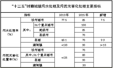 根據(jù)《“十二五”全國城鎮(zhèn)污水處理及再生利用設(shè)施建設(shè)規(guī)劃》要求,到2015年,全國所有設(shè)市城市和縣城具有污水集中處理能力;城市污水處理率達到85%(直轄市、省會城市和計劃單列市城區(qū)實現(xiàn)污水全部收集和處理,地級市85%,縣級市70%),縣城污水處理率平均達到70%,建制鎮(zhèn)污水處理率平均達到30%;直轄市、省會城市和計劃單列市污泥無害化處理處置率達到80%,其他設(shè)市城市達到70%,縣城及重點鎮(zhèn)達到30%。