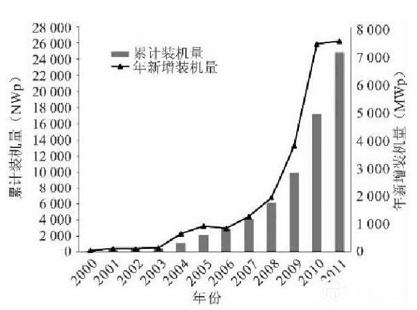 圖3 德國2000~2011年光伏年新增及累計裝機(jī)量