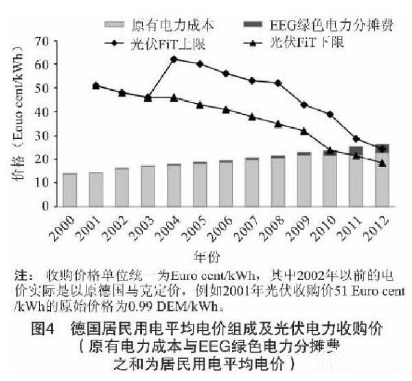 由圖4中折線變化可見,2004年以前光伏只有一個上網(wǎng)補(bǔ)貼價格。2004年起,根據(jù)所安裝光伏系統(tǒng)的規(guī)模,對其所發(fā)光伏電給予有差異的上網(wǎng)補(bǔ)貼電價。從2004年起至2009年,F(xiàn)iT補(bǔ)貼率下降趨勢相對平穩(wěn),但自2009年起FiT補(bǔ)貼率下降速度加快,至2012年光伏上網(wǎng)電價補(bǔ)貼率上下限均低于德國居民用電價格的平均值。
