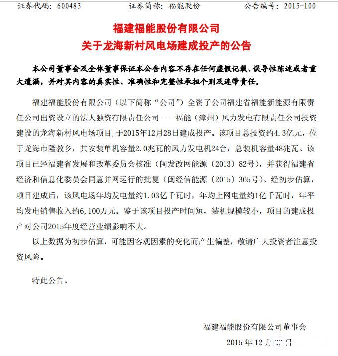 福能股份(600483)28日晚間公告,公司全資子公司福建省福能新能源有限責(zé)任公司出資設(shè)立的法人獨(dú)資有限責(zé)任公司——于2015年12月28日建成投產(chǎn)。