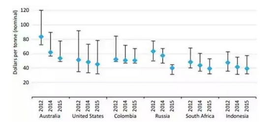 全球煤炭?jī)?chǔ)備充足,開發(fā)煤礦的成本適中。因此,影響煤價(jià)的關(guān)鍵因素是產(chǎn)量和運(yùn)輸成本的變化,也就是現(xiàn)金成本(通過關(guān)閉煤礦可以避免的開銷)??偟膩砜?,決定價(jià)格的煤礦通常是較老、較小的礦井,他們已經(jīng)收回了資金成本,幾乎僅依據(jù)可變成本來進(jìn)行生產(chǎn)決策。可變生產(chǎn)成本隨著時(shí)間變化,受到如增加工資,柴油機(jī)、鋼鐵、電力和炸藥等關(guān)鍵生產(chǎn)投入的價(jià)格變化等因素的影響。此外,外匯匯率也會(huì)對(duì)煤價(jià)產(chǎn)生巨大影響。