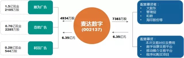 2015年7月,公告擬6.35億元(40%現(xiàn)金+60%股份)支付收購(gòu)順為廣告、奇思廣告和利宣廣告各100%股權(quán)。