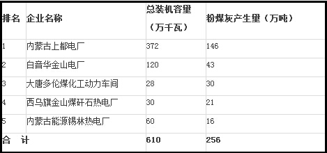 2014年,錫林郭勒盟煤電裝機容量合計623.2萬千瓦,粉煤灰產(chǎn)生量265萬噸,綜合利用量達到150萬噸,綜合利用率56.6%。全盟產(chǎn)生粉煤灰的前五位企業(yè),粉煤灰排放量合計256萬噸,占全市粉煤灰產(chǎn)生總量的97%(見表3):