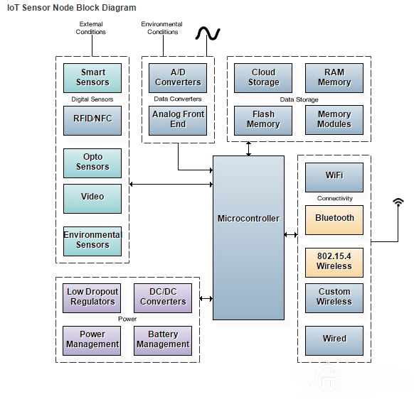 物聯(lián)網(wǎng)傳感器節(jié)點(diǎn)框圖,包含802.15.4無(wú)線、A / D轉(zhuǎn)換器、模擬前端、電池管理、藍(lán)牙、云存儲(chǔ)、自定義無(wú)線、直流/直流轉(zhuǎn)換器、環(huán)境傳感器、閃存、內(nèi)存模塊、單片機(jī)、RAM內(nèi)存、RFID / NFC 、光電傳感器、電源管理、智能傳感器、視頻、無(wú)線網(wǎng)絡(luò)。