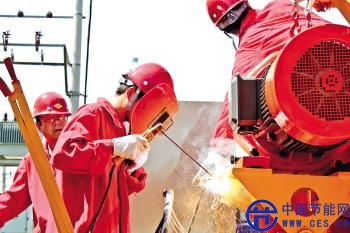 河北格洛斯節(jié)能設(shè)備公司施工人員為傳統(tǒng)采油機(jī)換裝伺服變矩電機(jī)。   范寧 攝