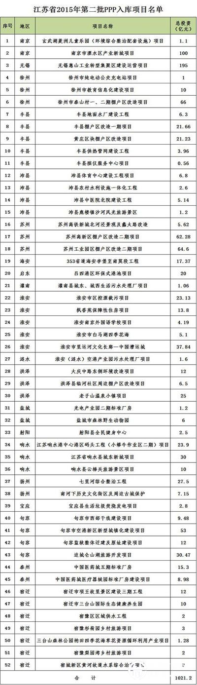 核心提示:近日,江蘇省財政廳發(fā)布了《關(guān)于江蘇省2015年度第二批政府和社會資本合作(PPP)項目入庫的通知》,確定了52個入庫PPP項目,總投資逾千億元。其