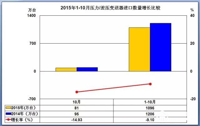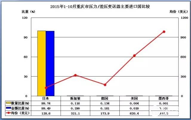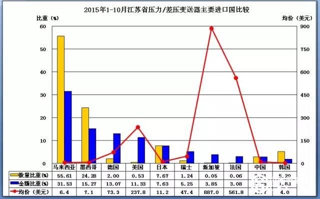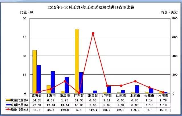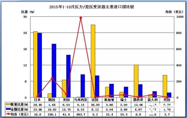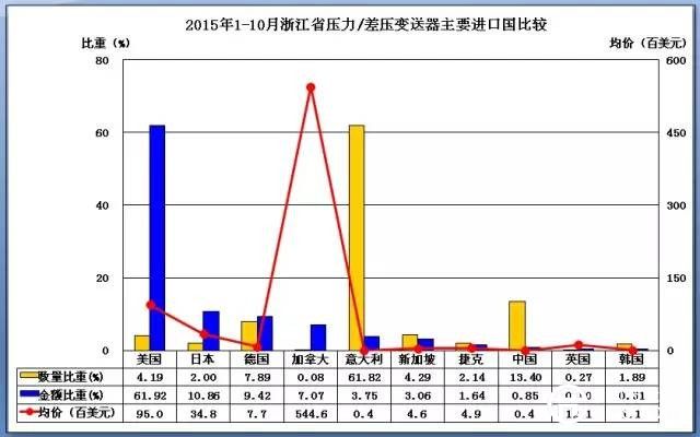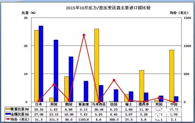 2015年1-10月我國壓力/壓差變送器進(jìn)口10964478個(gè),總金額達(dá)到188268242美元(約12億元人民幣),均價(jià)為17.17美元(約112元人民幣)。其中比利時(shí)的均價(jià)1179.3美元(約7676元人民幣)最高