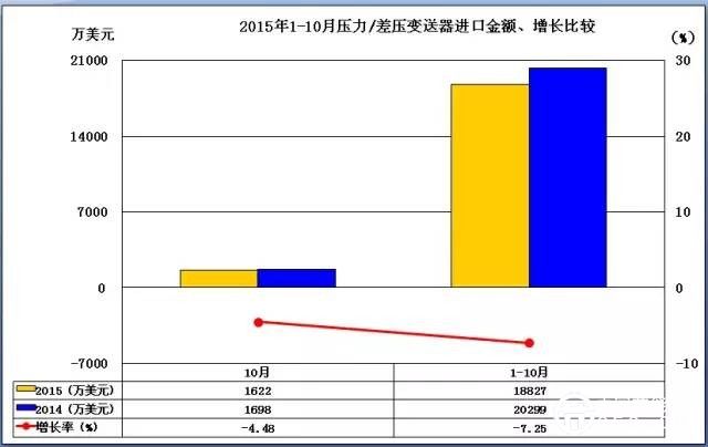 根據(jù)最新數(shù)據(jù)統(tǒng)計(jì),2015年10月我國壓力/壓差變送器進(jìn)口807829個(gè),進(jìn)口國家遍布29個(gè)地區(qū)??偨痤~達(dá)到16220538美元(約1.06億元人民幣),均價(jià)為20.08美元(約131元人民幣)。其中荷蘭的均價(jià)為3005.6美元(約19560元人民幣)最高(進(jìn)口16個(gè)),印度均價(jià)1230.1美元(約8000元人民幣)列第二位(進(jìn)口8個(gè))。