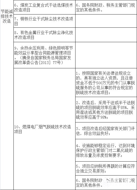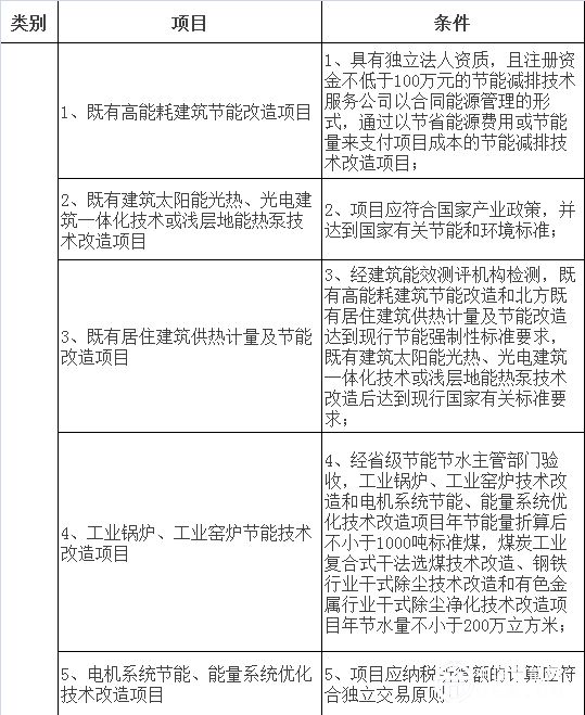 余熱余壓利用、綠色照明等節(jié)能效益分享型合同能源管理項(xiàng)目、工業(yè)鍋爐、工業(yè)窯爐節(jié)能技術(shù)改造項(xiàng)目等具有獨(dú)立法人資質(zhì),且注冊(cè)資金不低于100萬(wàn)元的節(jié)能減排技術(shù)服務(wù)公司以合同能源管理的形式,通過(guò)以節(jié)省能源費(fèi)用或節(jié)能量來(lái)支付項(xiàng)目成本的節(jié)能減排技術(shù)改造項(xiàng)目;燃煤電廠煙氣脫硫技術(shù)改造項(xiàng)需按照國(guó)家有關(guān)法律法規(guī)設(shè)立的,具有獨(dú)立法人資質(zhì),且注冊(cè)資金不低于500萬(wàn)元的專(zhuān)門(mén)從事脫硫服務(wù)的公司從事的符合規(guī)定的脫硫技術(shù)改造項(xiàng)目;