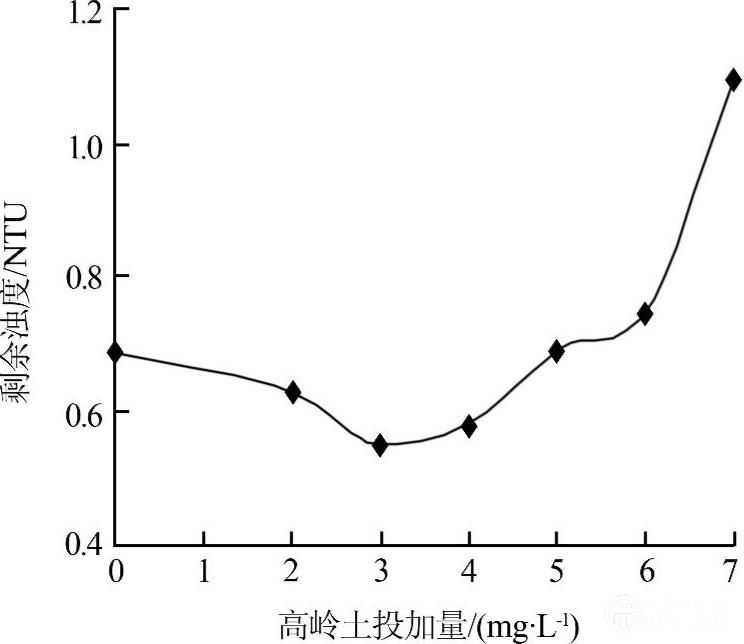 為提高FeCl3的絮凝效果,采用當(dāng)?shù)爻R姷母邘X土作為助凝劑。試驗(yàn)條件:水樣初始濁度為2.21 NTU,水溫18 ℃,pH調(diào)至8.03,F(xiàn)eCl3投加量為3.6 mg/L。改變高嶺土投加量進(jìn)行試驗(yàn),取上清液測(cè)定剩余濁度,測(cè)定結(jié)果如圖1所示。