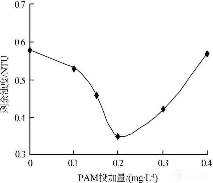 試驗(yàn)條件:水樣初始濁度為2.72 NTU,水溫18 ℃,pH調(diào)至8.0,F(xiàn)eCl3投加量為3.6 mg/L。以PAM為助凝劑,其投加量為0.1~0.4 mg/L,測(cè)定上清液的剩余濁度,結(jié)果如圖3所示。