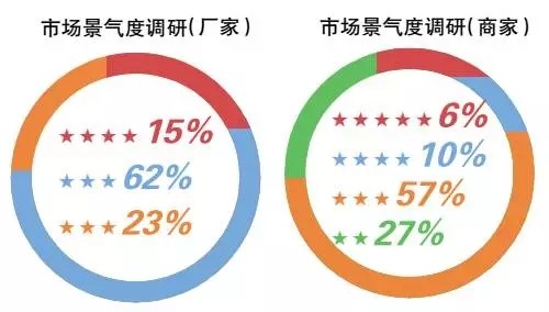 為了更深層次地了解2015年廠商的經(jīng)營實(shí)況,大照明全平臺面向全國照明廠商以“5顆星”為標(biāo)準(zhǔn),對“2015年市場景氣度”進(jìn)行調(diào)研。調(diào)研結(jié)果顯示,企業(yè)方面,認(rèn)為市場景氣度值3顆星的占比為62%,2顆星的占比為23%;而認(rèn)為市場并沒有想象中的那么糟糕,值4顆星的占比為15%。商家方面,認(rèn)為市場景氣度值5顆星的占比6%,4顆星的占比10%,3顆星的占比57%,2顆星的占比為29%。從整體上來看,雖然不少廠商在抱怨生意難做、賣場蕭條、庫存壓力大、電商沖擊等,但是部分廠商依舊取得了令人欣慰的好成績。