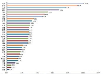 北京地區(qū)2015年分析儀器采購金額為9.4億元,占全國采購金額的10%,居各省份首位,其余依次為廣東、山東、四川和浙江,這五省采購中標金額總數(shù)占總中標金額的39.1%,屬于2015年的采購大省。