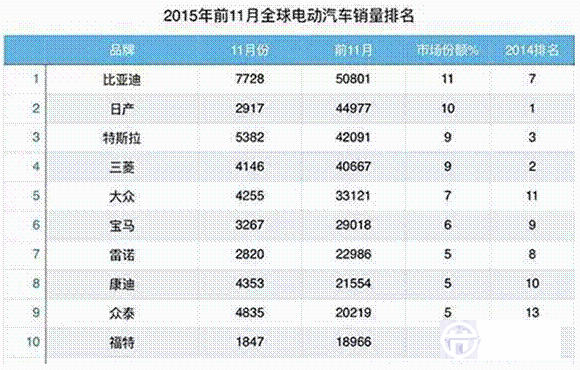 我們在上表的2014年排名中瞧出一些端倪。沒錯,中國自主品牌的電動車又把世界電動車市場攪翻了??档闲茇圗V在2014年時世界排名還是26位,今年截至11月份已經上升至第6位,并且占有了世界市場4%的份額。同樣上來的還有北汽新能源。