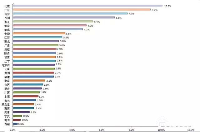 北京地區(qū)2015年分析儀器采購(gòu)金額為9.4億元,占全國(guó)采購(gòu)金額的10%,居各省份首位,其余依次為廣東、山東、四川和浙江,這五省采購(gòu)中標(biāo)金額總數(shù)占總中標(biāo)金額的39.1%,屬于2015年的采購(gòu)大省。