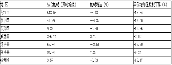 (一)縣區(qū)消費(fèi)不平衡,能耗差異明顯。從規(guī)模工業(yè)綜合能耗總量看,市中區(qū)、東興區(qū)、資中縣和經(jīng)開區(qū)同比分別下降54.3%、0.5%、22.5%、5.3%,隆昌縣和威遠(yuǎn)縣分別增長7.2%,3.7%。各縣區(qū)單位工業(yè)增加值能耗均不同程度下降,其中,市中區(qū)單位增加值能耗降幅為19.0%,資中縣、東興區(qū)、經(jīng)開區(qū)、隆昌縣和威遠(yuǎn)縣分別下降16.5%、11.6%、15.5%、6.3 %和3.0%,縣區(qū)之間差異明顯。