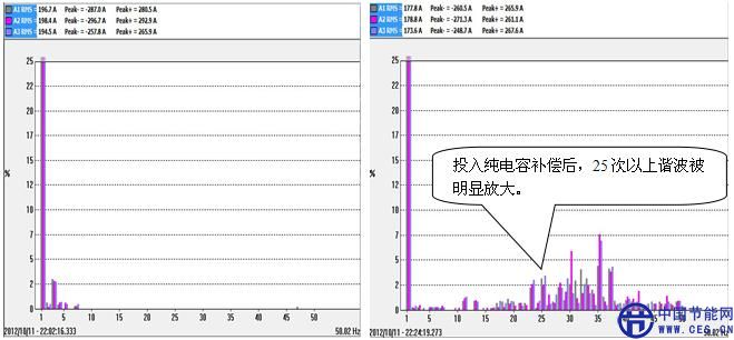 未投入純電容補償前特征次諧波電流幅值圖 投入純電容補償后特征次諧波電流幅值圖
