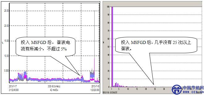 投運MSFGD后三相電流總諧波畸變率趨勢圖 投入MSFGD后各特征次諧波電流幅值圖