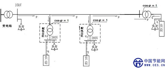 圖3是全無(wú)功隨器就地補(bǔ)償方式,配電線(xiàn)路中只有有功功率p流動(dòng)(用實(shí)線(xiàn)條表示)。無(wú)功功率q用虛線(xiàn)條表示。