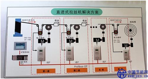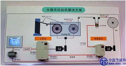針對(duì)直進(jìn)式拉絲機(jī),LS產(chǎn)電提供包括PLC、HMI和變頻器的整套解決方案。即便是使用模擬量傳遞,LS解決方案也可以利用模擬量旁路功能,傳遞壓縮比率信號(hào),任意停止某個(gè)卷筒。內(nèi)置快速停車功能,在非正常停車情況下快速停止也不會(huì)斷線。針對(duì)水箱式拉絲機(jī),LS的解決方案也可以不需要PLC,僅在變頻器內(nèi)部就可以完成直徑計(jì)算、張力控制、短線檢測(cè)、排線控制等一些列復(fù)雜功能。