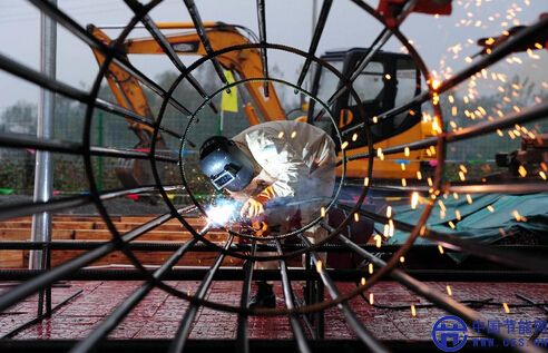在安徽省池州市貴池區(qū)烏沙鎮(zhèn),安徽送變電工程公司的施工人員在進(jìn)行鋼筋籠焊接施工。