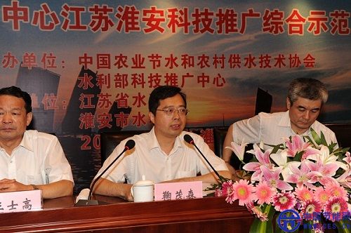 參加會(huì)議的有水利部科技推廣中心、水利部灌溉排水發(fā)展中心、中國農(nóng)業(yè)節(jié)水和農(nóng)村供水技術(shù)協(xié)會(huì)、江蘇省水利廳、山西省水利廳、河海大學(xué)、揚(yáng)州大學(xué)、南京水科院等單位的有關(guān)領(lǐng)導(dǎo)及專家,國內(nèi)外部分企業(yè)的代表、淮安市水利系統(tǒng)的部分干部職工、以及新聞單位代表共120多人。會(huì)議由中國農(nóng)業(yè)節(jié)水和農(nóng)村供水技術(shù)協(xié)會(huì)秘書長鞠茂森主持。江蘇省水利廳陶長生副廳長、淮安市政協(xié)王士高副主席到會(huì)祝賀?;窗彩腥嗣裾畯埵孛栏泵貢L、江蘇省水利廳科技處黃章羽處長分別致辭。水利部科技推廣中心許平副主任講話并宣讀了“江蘇省淮安科技推廣綜合示范區(qū)”的授牌文件。水利部科技推廣中心許平副主任、淮安市水利局黃克清局長共同為“江蘇淮安水利科技綜合示范區(qū)”揭牌。
